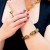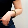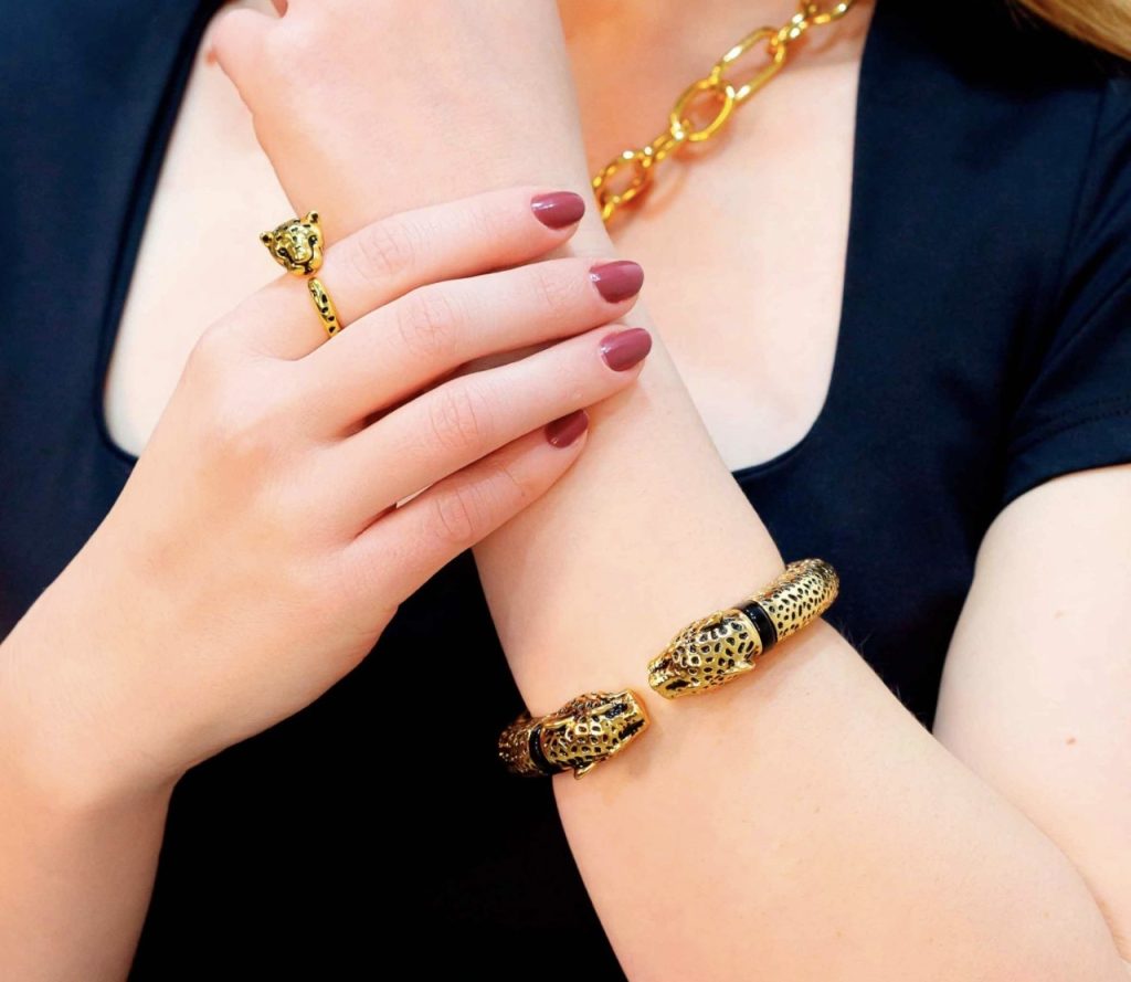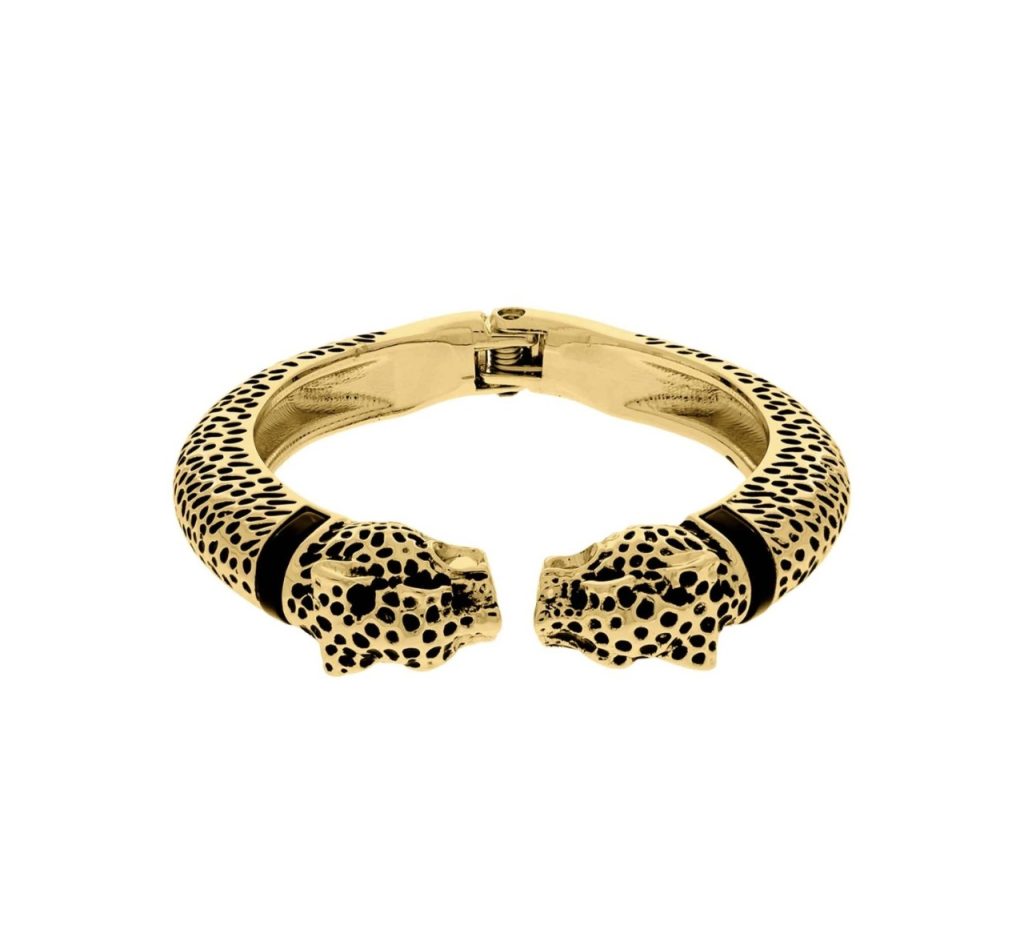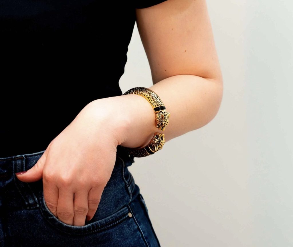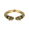 FIERA es un cuff rígido con figura escultórica en ambos extremos y cuerpo texturado en negro sobre dorado. Una pieza de carácter declarado, sin neutralidad, sin sutileza.