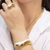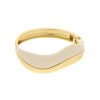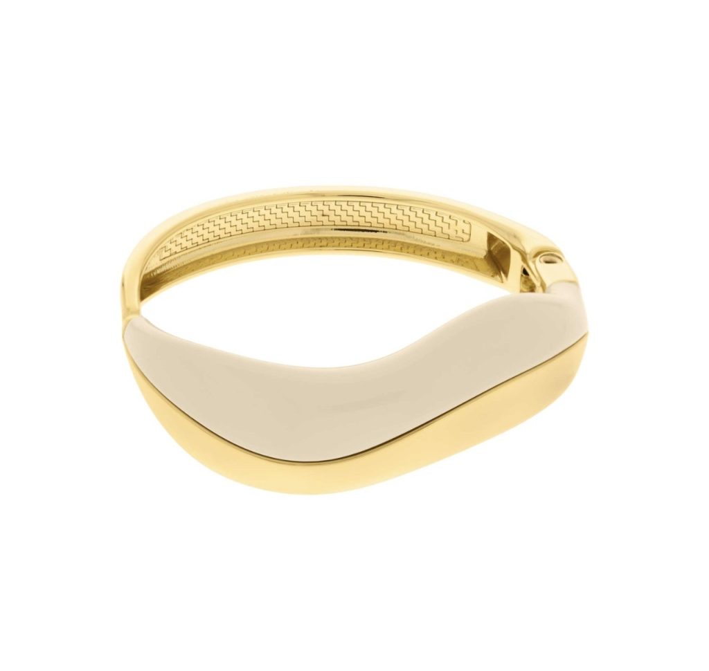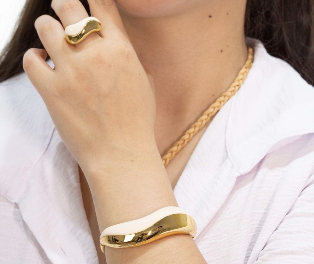 CALMA es un cuff de forma orgánica que combina estructura dorada con panel interior de acrílico blanco mate. El contraste no es decoración, es la composicion completa.